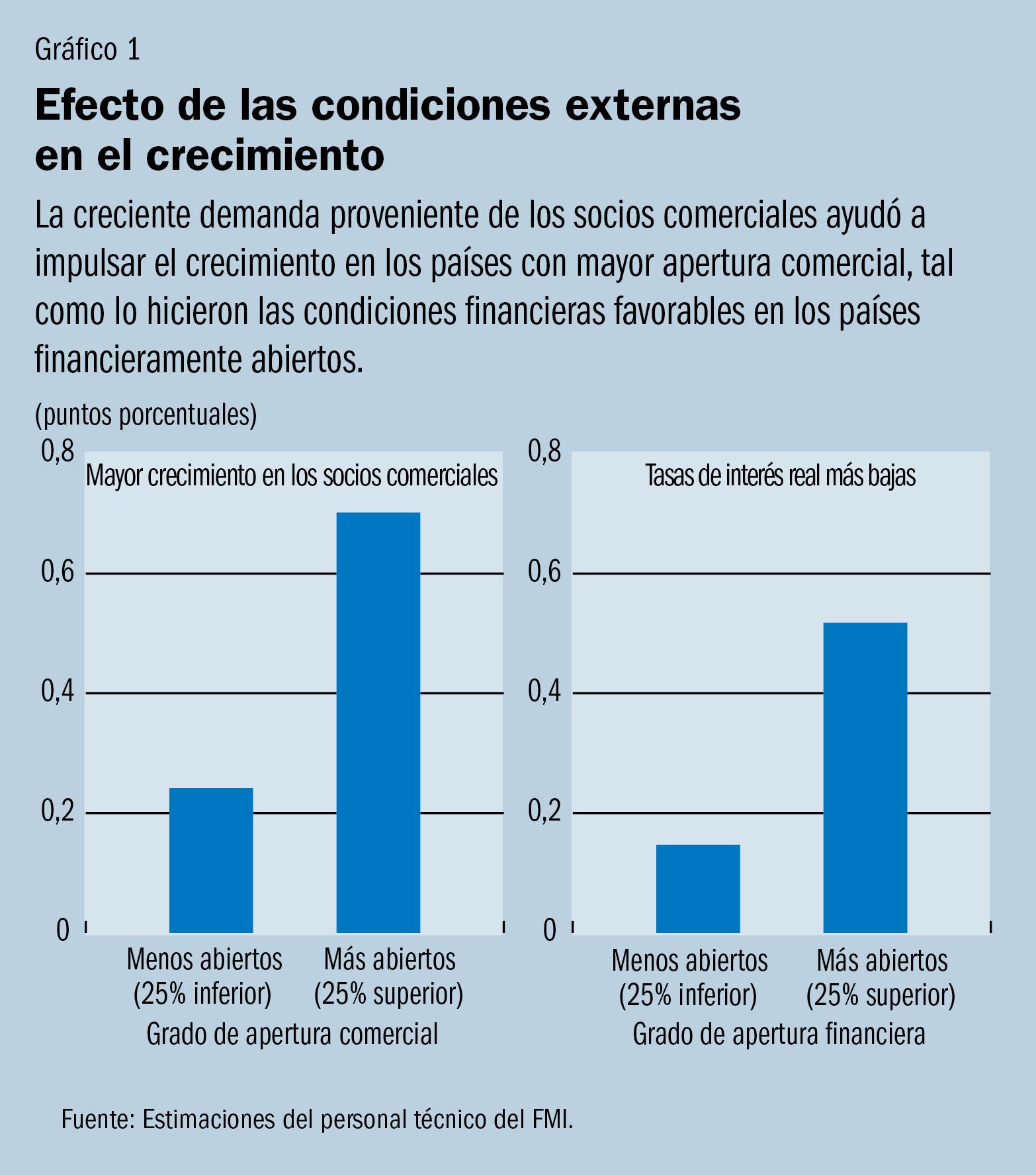 La década de 2000: Un contexto mundial favorable con efectos desiguales Una confluencia de condiciones externas favorables fomentó el crecimiento de los mercados emergentes en la década de 2000. La creciente demanda mundial y la expansión de las cadenas de suministro incentivaron el comercio mundial, en tanto que las tasas de interés más bajas en las economías avanzadas crearon condiciones financieras más favorables. El extraordinario ciclo experimentado por los precios de las materias primas impulsó el crecimiento en muchos países emergentes y en desarrollo exportadores de dichas materias. Y gracias a la mayor apertura comercial y financiera, los mercados emergentes pudieron aprovechar estas condiciones. No obstante, las ventajas de esta favorable coyuntura externa variaron significativamente en los distintos mercados emergentes. La creciente demanda proveniente de los socios comerciales aportó, en promedio, medio punto porcentual al crecimiento en los países con mayor apertura comercial. Las condiciones de financiamiento favorables impulsaron la inversión y añadieron, en promedio, más de un tercio de punto porcentual al crecimiento en países financieramente abiertos, en tanto que los altos precios de las materias primas facilitaron mayores niveles de inversión y crecimiento en las economías que dependen más de las materias primas (gráfico 1).